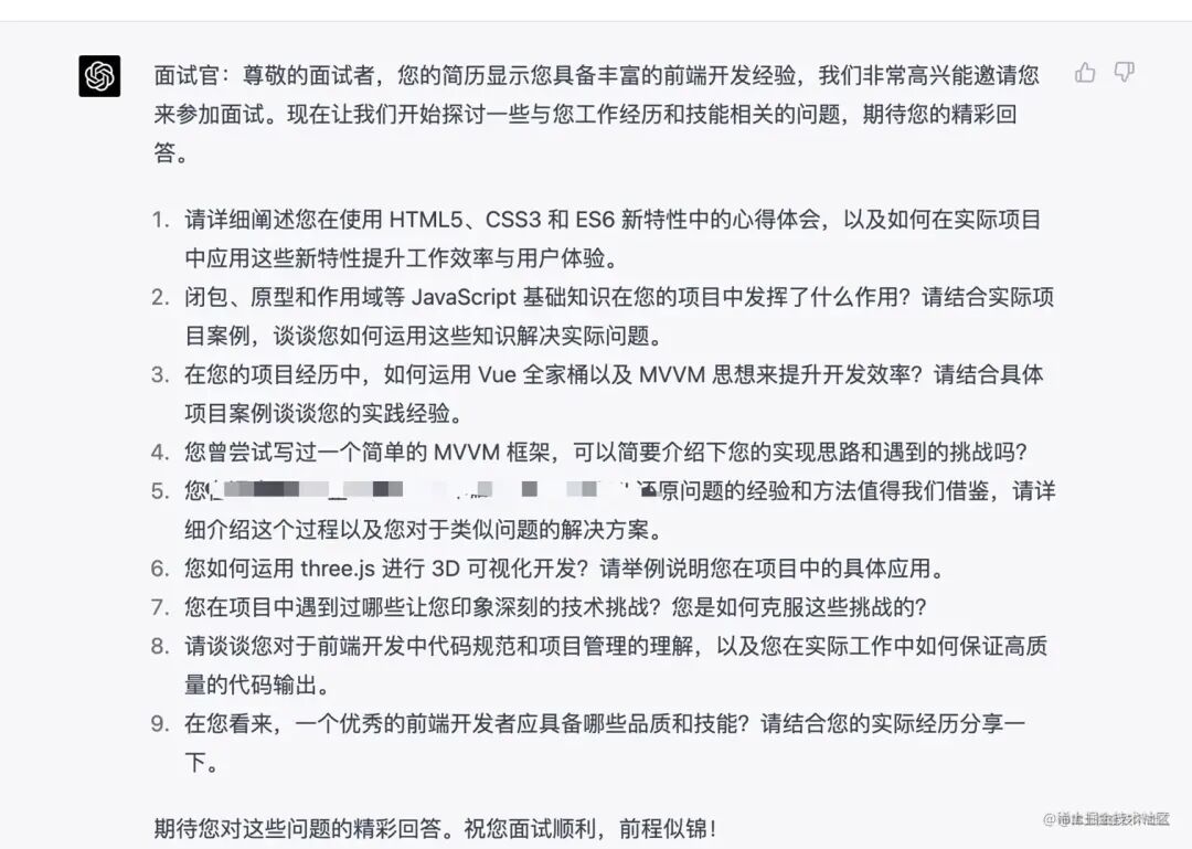这样我们此次模拟面试就获得了 9 条关于项目的问题,和 25 条关于基础的问题,细看这几个问题都是明显贴合我的简历所问的问题,大部分面试官都是会针对简历进行面试,所以根据自己的简历整理可能提到的问题是非常重要的,而关于项目方面提出的问题,与我进行大厂模拟面试所遇到的问题更为相像。通过 chatGPT 进行模拟面试,算得上是一场挺有质量的面试了。