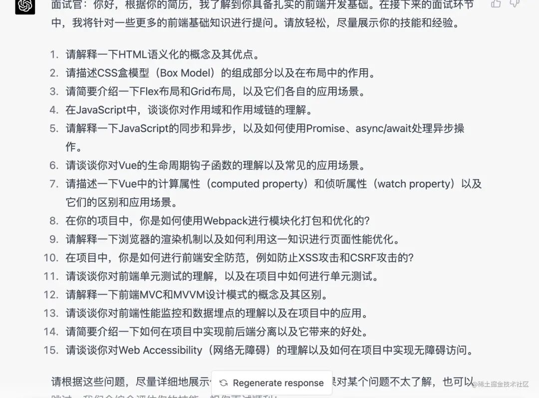 可以看出 chatGTP 的模拟面试其实更偏向于对项目方面进行模拟面试,而我要求面试中包含大量八股文,这个是没有给到的,我意识到它可能是无法理解 “八股文” 在前端开发面试中代表的意思,于是我又换了个说法提问它。