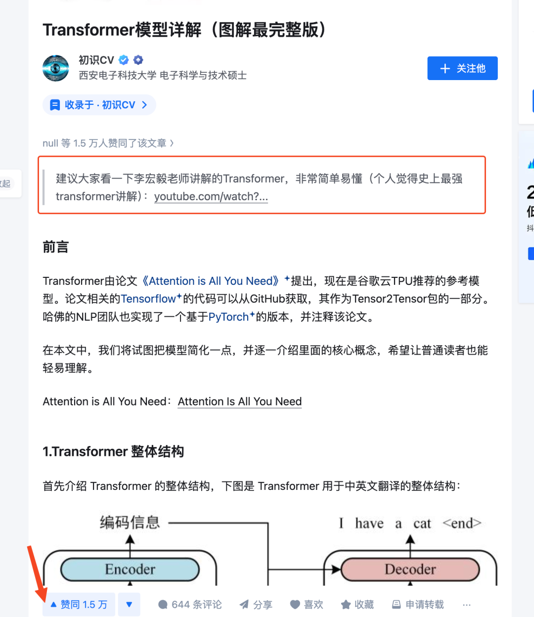 从知乎的 1.5 万点赞量就可以看出来这篇文章不一般了,文章开头就推荐去看李宏毅老师的视频,作者还觉得李老师关于 Transformer 的讲解是史上最强的!