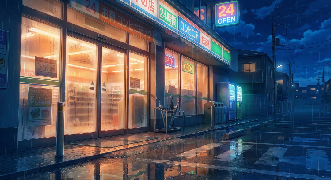 案例原始提示词:“动漫风格,晚上,便利店门口,空无一人,下着小雨”