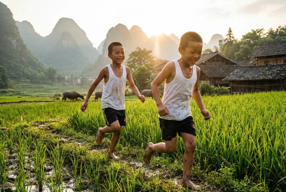 案例原始提示词:“摄影,2 个在田野里奔跑的中国南方乡村小男孩”