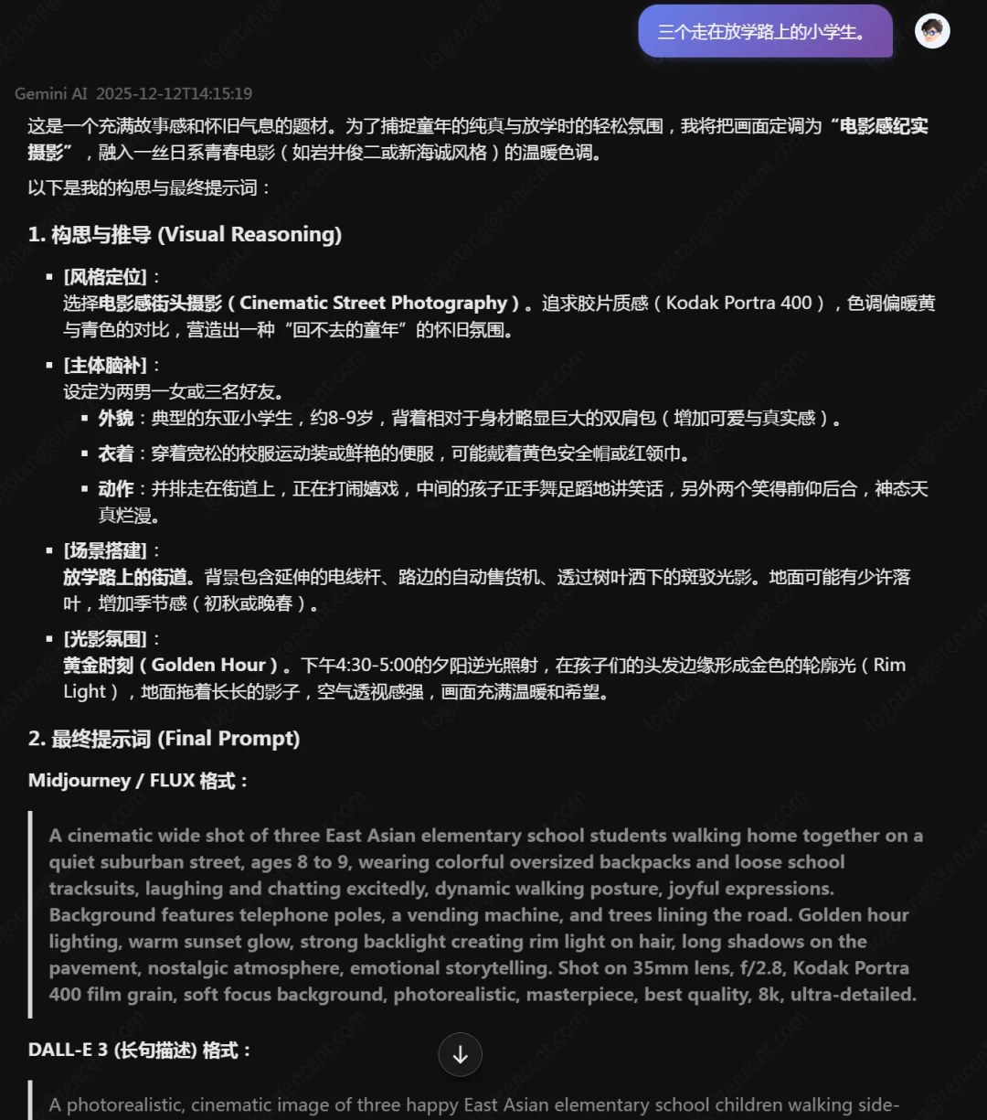 细节脑补:自动补充缺失的细节(如:光影、衣着材质、环境氛围、镜头语言),使画面具有电影级的叙事感。