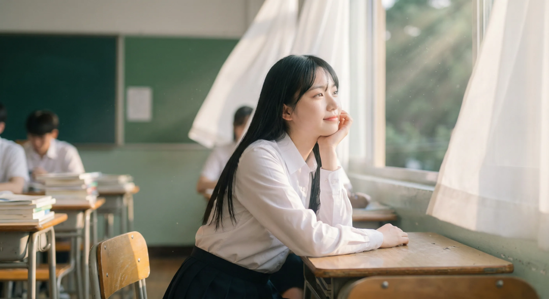[场景搭建]:典型的东亚高中教室,背景有模糊的黑板和堆满书的课桌,窗帘被风吹起。