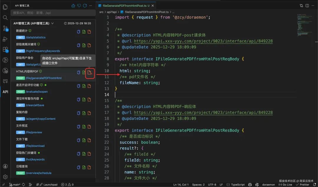 TypeScript虽然提升了类型安全,但这也意味着每次接入新接口、调整字段结构时,我们都需要手动补充 / 修改对应的请求与响应类型。重复性劳动频繁:接口结构变更后,开发者不得不反复同步文档、更新类型文件、调整调用方式,这类机械操作既耗时也容易遗漏。