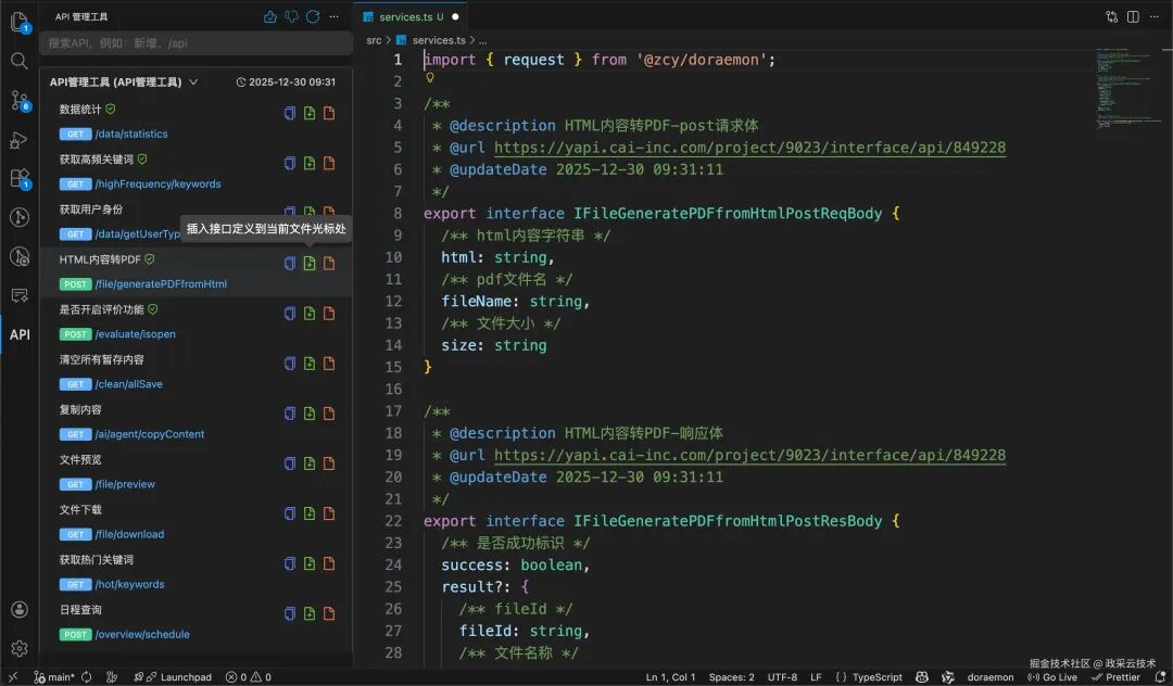 基于这样真实且反复出现的开发痛点,我们决定开发一款 VSCode 插件,通过工具化的方式解决这些工程中的 “隐性成本”,统一接口来源、减少重复劳动,并补齐编辑器内的提示能力,从而提升整个团队的研发效率。