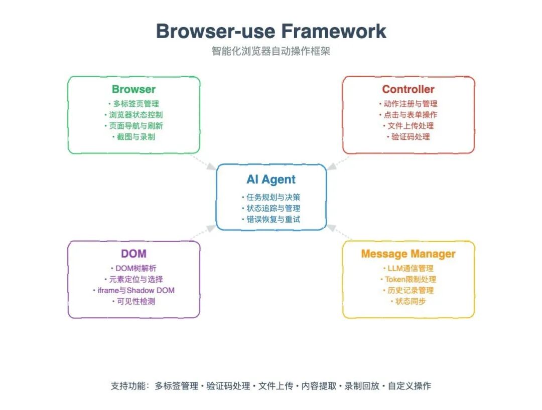 通过这些技术,Browser-use 能够在多种不同的网页环境中高效运行,实现多种自动化任务。