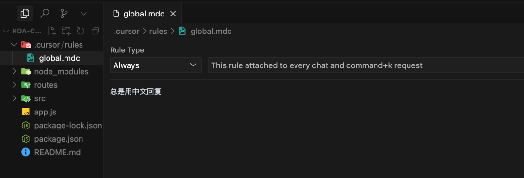 <cursor_rules_context>Cursor Rules are extra documentation provided by the user to help the AI understand the codebase.Use them if they seem useful to the user’s most recent query, but do not use them if they seem unrelated.Rule Name: global.mdcDescription:总是用中文回复</cursor_rules_context>之前设置的 Cursor rules。