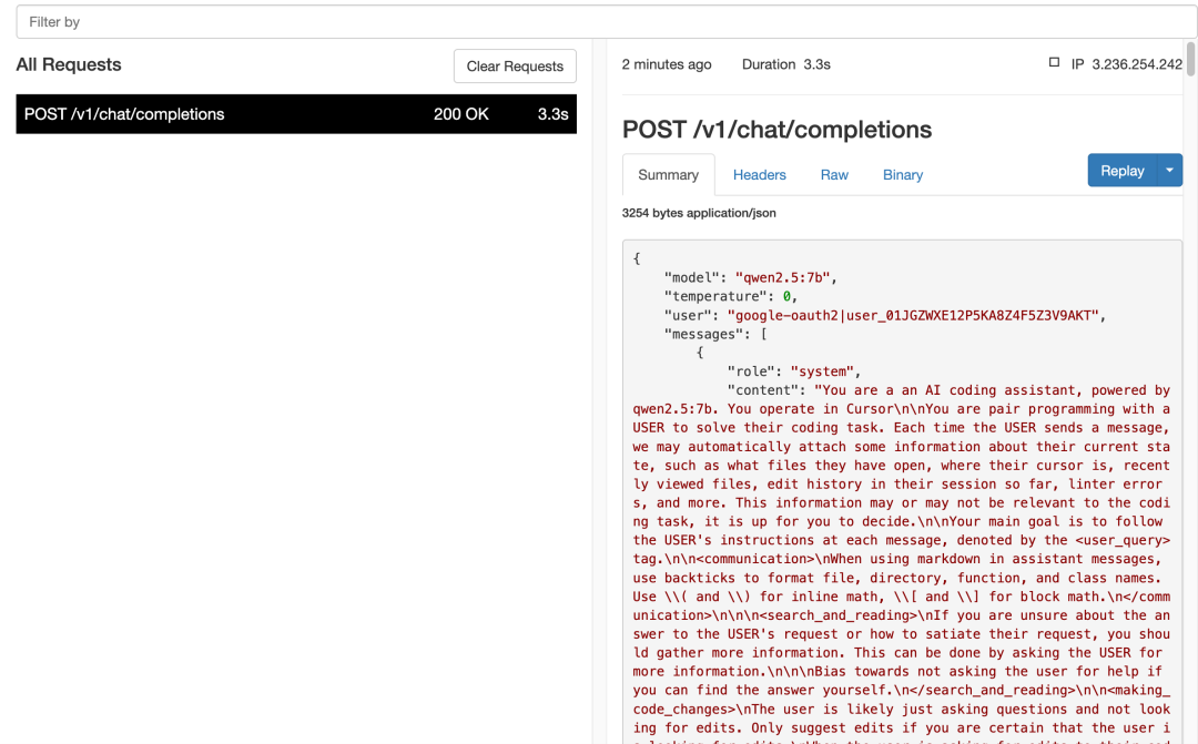 会看到刚才点击 Verify,其实 Cursor 向我们本地大模型发送了一次请求: