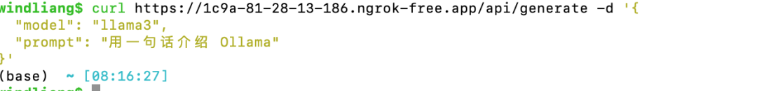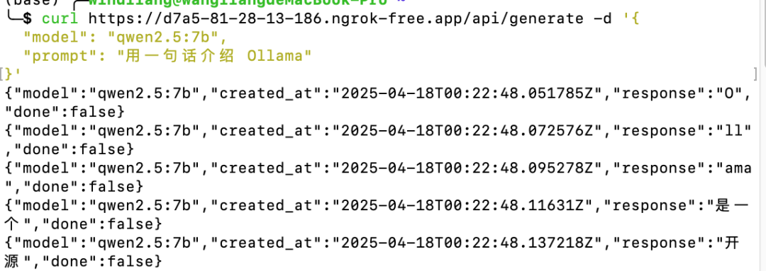 curl https://d7a5-81-28-13-186.ngrok-free.app/api/generate -d '{ "model": "qwen2.5:7b", "prompt": "用一句话介绍 Ollama"}'成功返回: