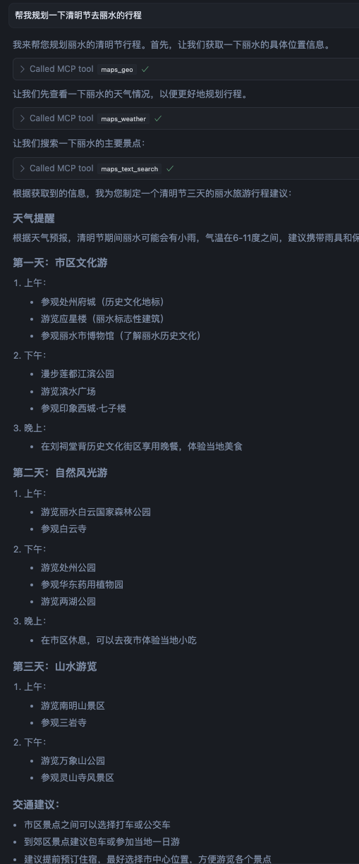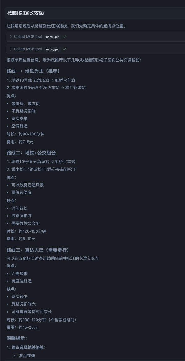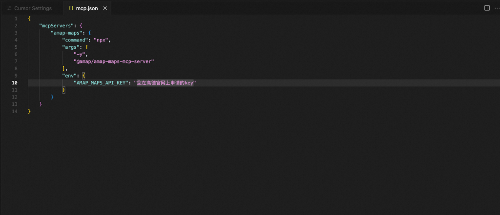 { "mcpServers": { "amap-maps": { "command": "npx", "args": [ "-y", "@amap/amap-maps-mcp-server" ], "env": { "AMAP_MAPS_API_KEY": "您在高德官网上申请的key" } } }}配置如下: