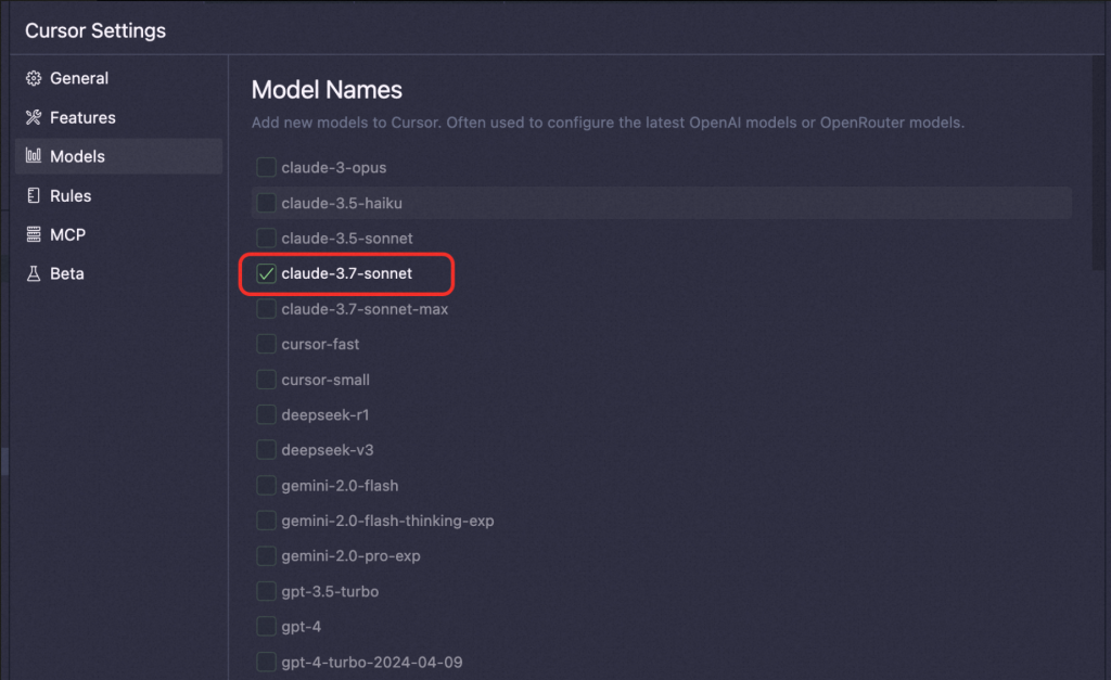4、选择配置 Cursor 大模型让你拥有更好的服务体验,建议选择 claude-3.7-sonnet