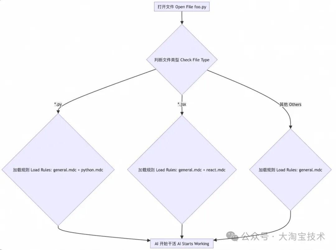 这个图大概意思就是:打开一个 .py 文件?好的,把通用规则 (general.mdc) 和 Python 专属规则 (python.mdc) 都给 AI 看。打开 .jsx 文件?那就通用规则加 React 规则。其他文件?就只看通用规则。这样是不是很智能?