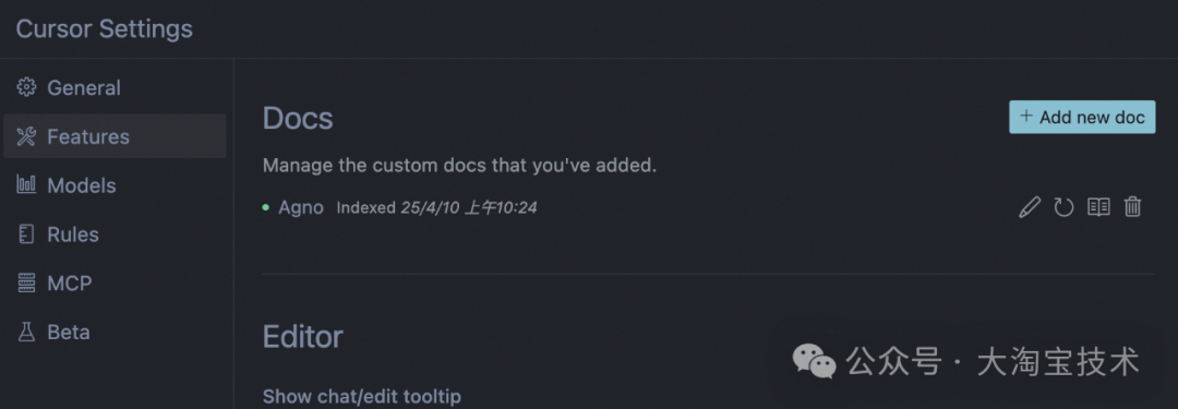 在 Cursor 里 "登记入学" (Register it in Cursor): 在 Cursor 里找到添加文档的功能(通常在聊天框输入
