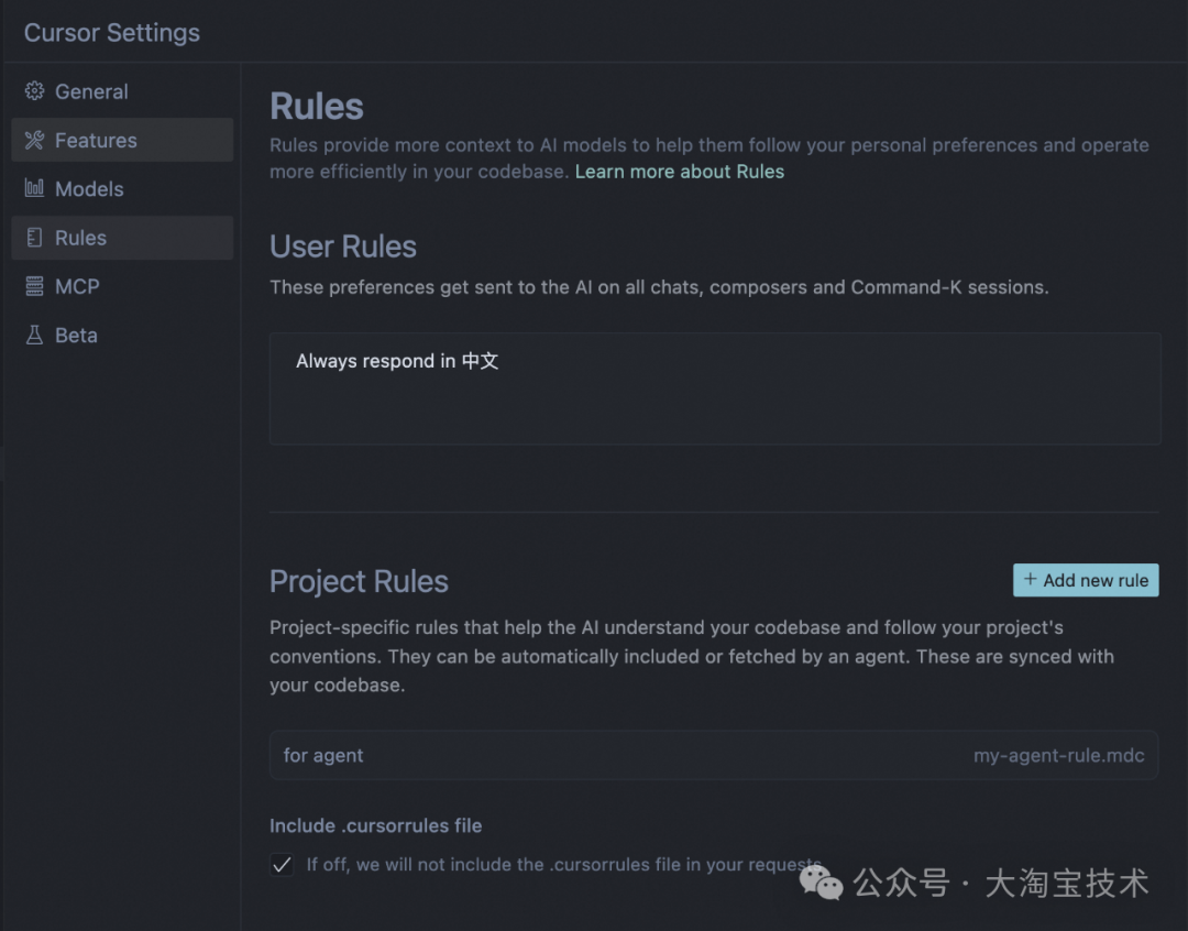 优先级 (Priority): 一般来说,项目特定规则的 "威力" 更大。如果全局规则说 "用 4 空格缩进",但当前项目的规则文件里写了 "用 2 空格缩进",那 AI 在这个项目里就会听项目规则的。当然,你得在全局设置里勾选 "包含 .cursorrules 文件"(或者类似的新选项)来启用项目规则。[5]