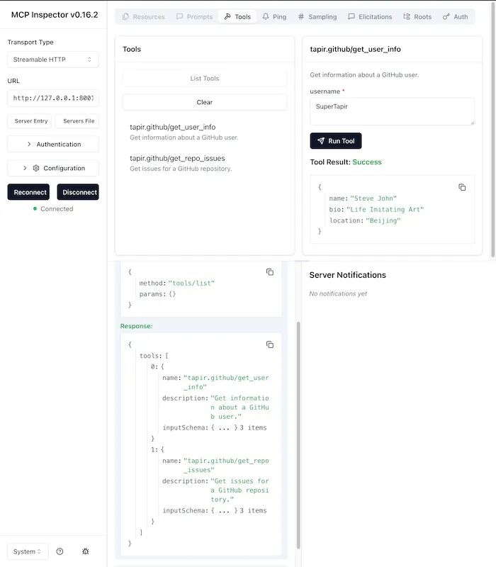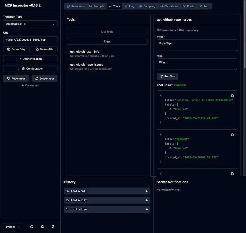 from mcp.server.fastmcp import FastMCPimport httpxmcp = FastMCP("StatelessServer", stateless_http=True)@mcp.tool()def get_github_user_info(username: str = "SuperTapir"): """Get information about a GitHub user.""" url = f"https://api.github.com/users/{username}" response = httpx.get(url) json = response.json() result = { "name": json["name"], "bio": json["bio"], "location": json["location"], } return result@mcp.tool()def get_github_repo_issues(owner: str = "SuperTapir", repo: str = "Blog"): """Get issues for a GitHub repository.""" url = f"https://api.github.com/repos/{owner}/{repo}/issues" response = httpx.get(url) issues = response.json() return [ { "title": issue["title"], "labels": [lbl["name"] for lbl in issue.get("labels", [])], "created_at": issue["created_at"], } for issue in issues ]if __name__ == "__main__": mcp.run(transport="streamable-http")通过 @modelcontextprotocol/inspector 我们可以方便的调试 MCP Server,可以看到和我们的预期是一致的。