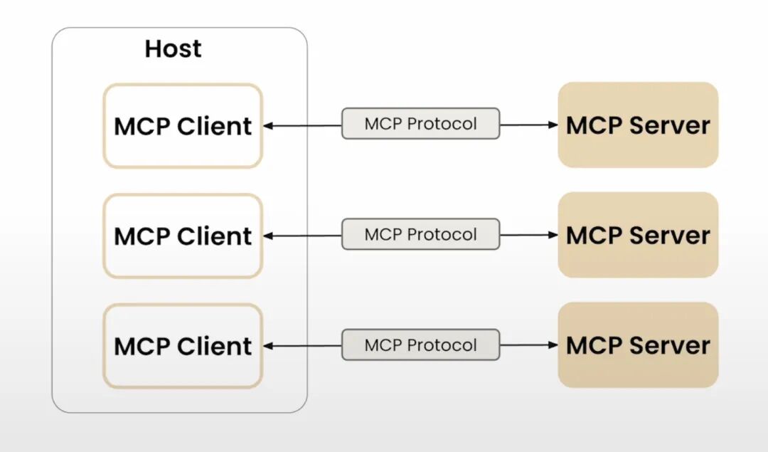 MCP 采用了 Client-Server(客户端 - 服务器)架构,有三个比较重要的组成部分: