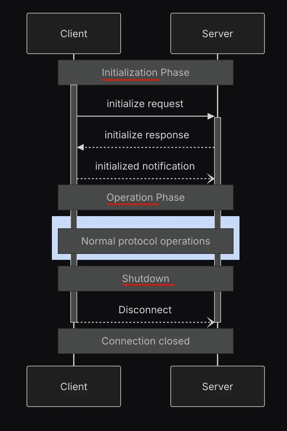 初始化(Initialization):Client 和 Server 进行握手和协议协商,完成初始化,并进行能力协商(capability negotiation),双方交换自己支持的原语和能力,建立通信能力边界