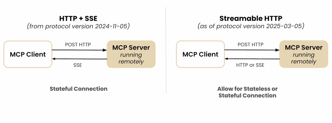 在 HTTP + SSE 传输模式下,Client 和 Server 建立长连接,Server 可以通过 SSE(Server‑Sent Events)向 Client 推送消息。虽说整个流程非常简单,但是 HTTP + SSE 问题在于,这种传输模式依赖长连接,是 stateful 的,这非常不利于扩展。另外,其实很多场景没有必要做 stateful,比如某些场景下 MCP Server 就是被调用一次就结束,那维持长连接就会显得非常鸡肋,完全是在浪费资源。所以可以 stateful、可以 stateless 的 Streamable HTTP 就被提出了。