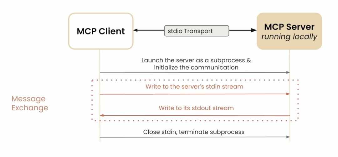 在 stdio 传输模式下,Host 直接以子进程形式启动 MCP Server,通过标准输入(stdin)发送 JSON‑RPC 请求,从标准输出(stdout)接收响应,无需网络层。适用于那些需要操纵用户本地机器的场景,比如连接用户本地的数据库、访问本地文件或者为用户本地创建文件等操作。