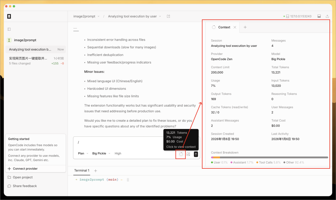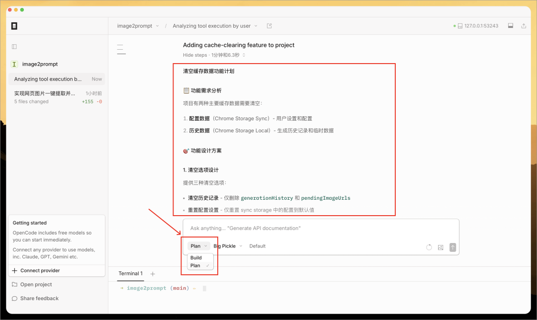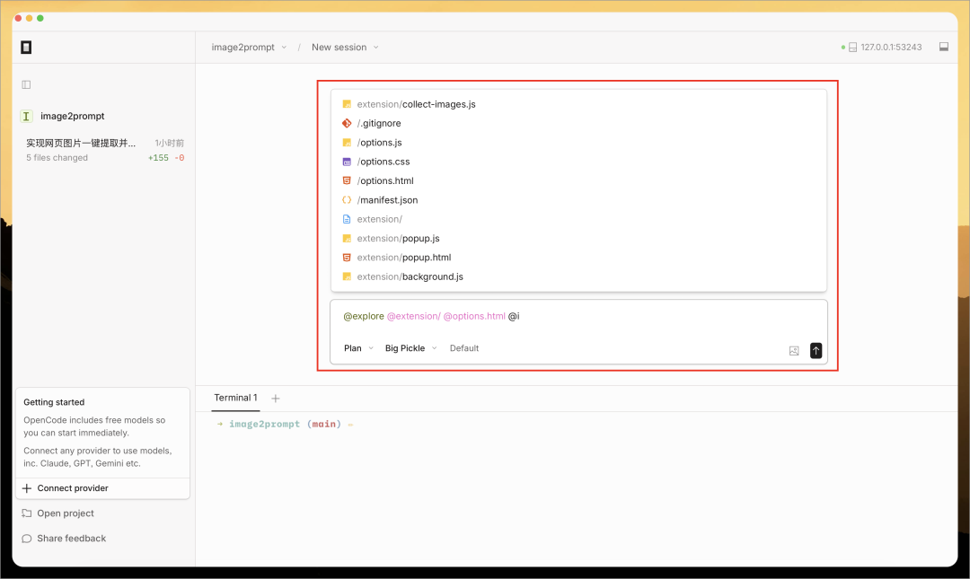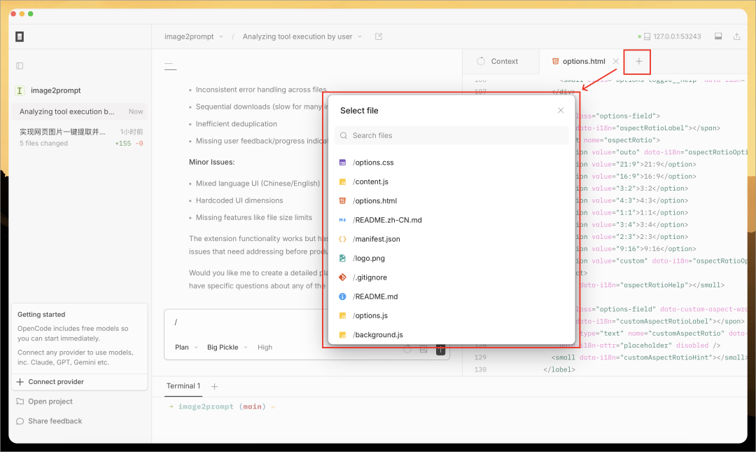 Chris 把之前 Vibe Coding 的一个浏览器插件项目(https://github.com/pingan8787/image2prompt)导入到 OpenCode,然后输入下面任务: