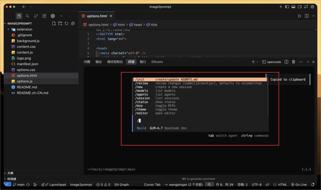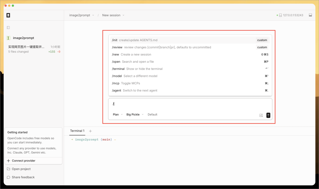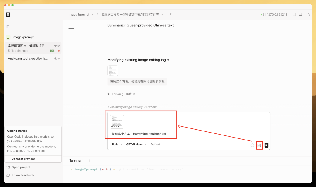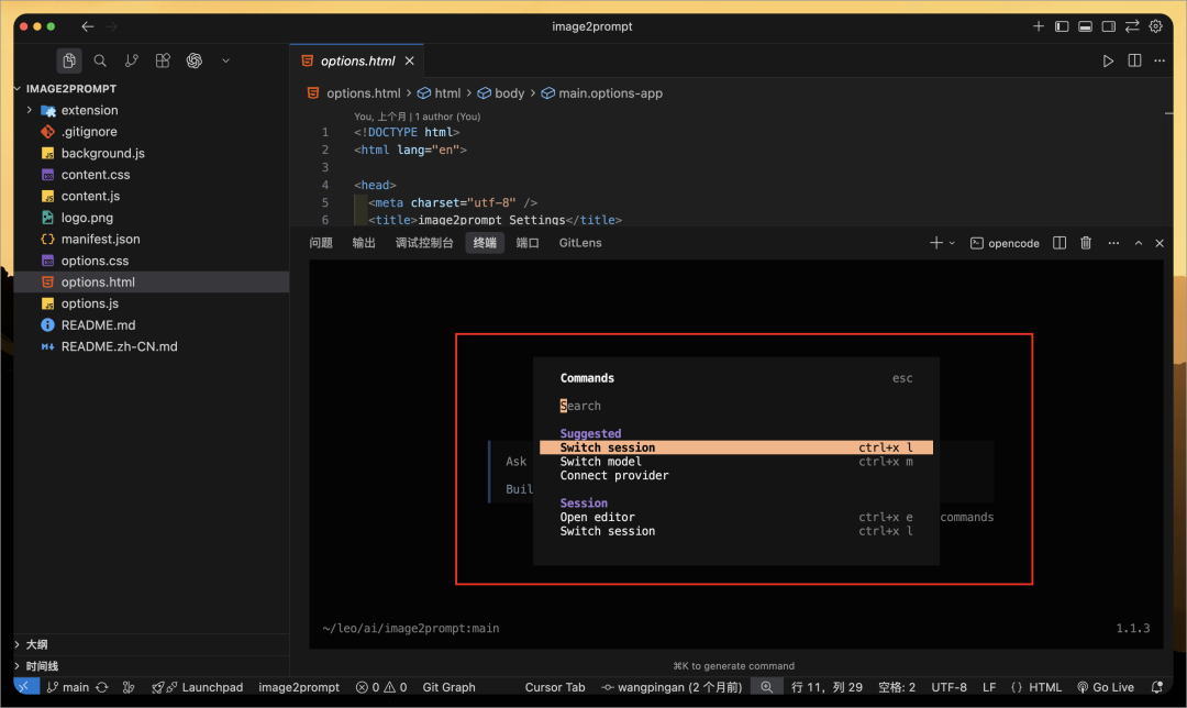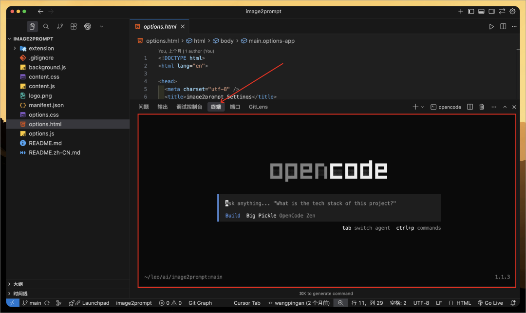 Chris 把之前 Vibe Coding 的一个浏览器插件项目(https://github.com/pingan8787/image2prompt)导入到 OpenCode,然后输入下面任务: