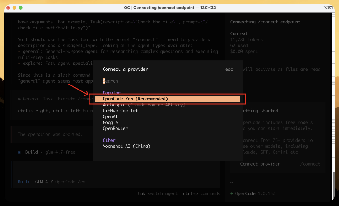 安装完成后,你需要连接模型。对于初学者,我建议直接使用官方托管的 OpenCode Zen,因为它提供了经过基准测试的稳定模型(如 GPT 5.1 Codex),能避免很多开源模型 “乱说话” 的情况。