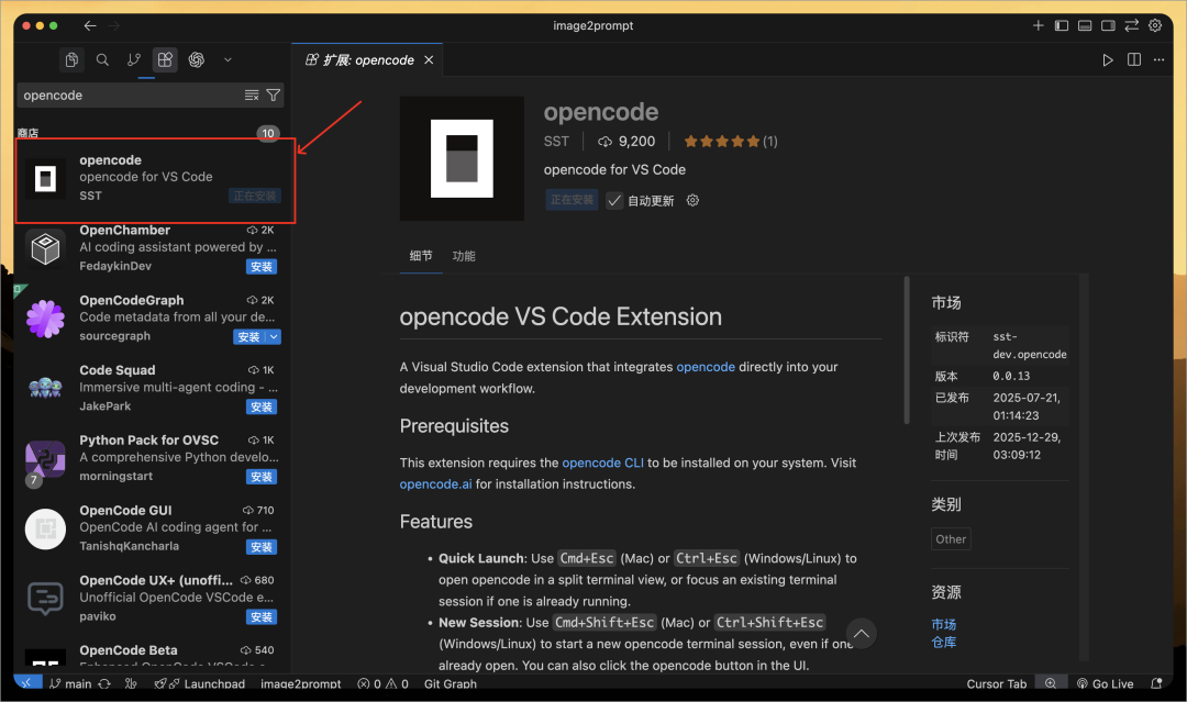 安装时,在拓展程序中搜索 “OpenCode” 即可下载安装: