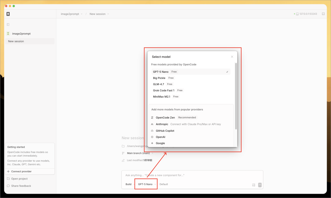支持的模型很多,还包括免费的 GPT-5 Nano、Big Pickle、GLM-4.7、Grok Code Fast 1、MiniMax M2.1: