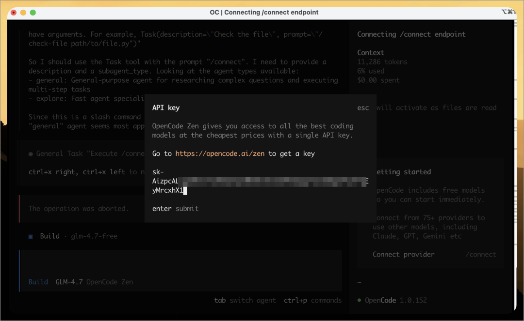 opencode然后在界面中输入 <font>/connect 并粘贴你的 API Key 即可。