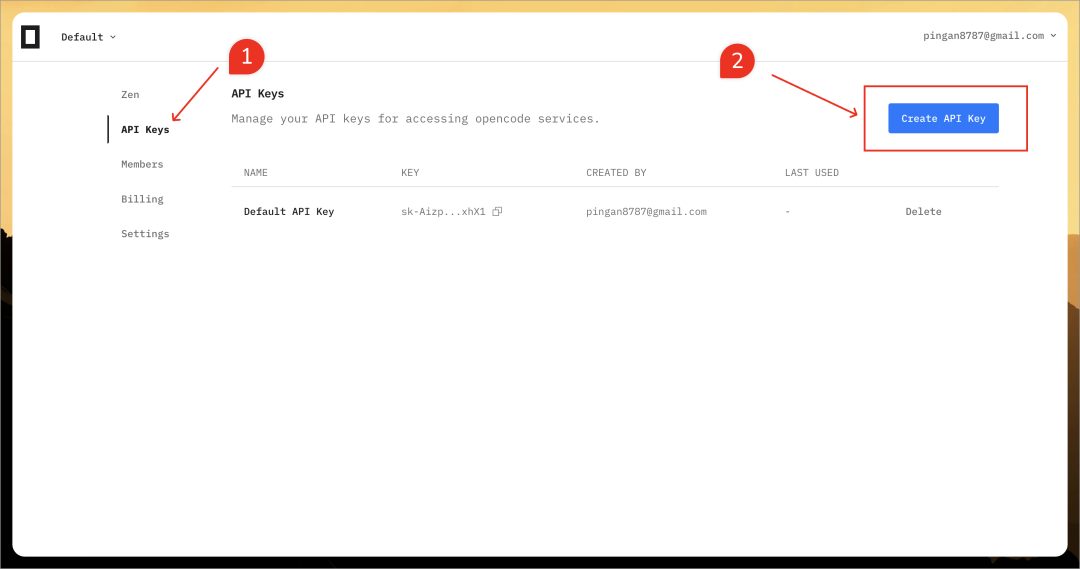 使用时,先打开 https://opencode.ai/zen 的 “API Keys” 标签页,创建一个新的 API Key: