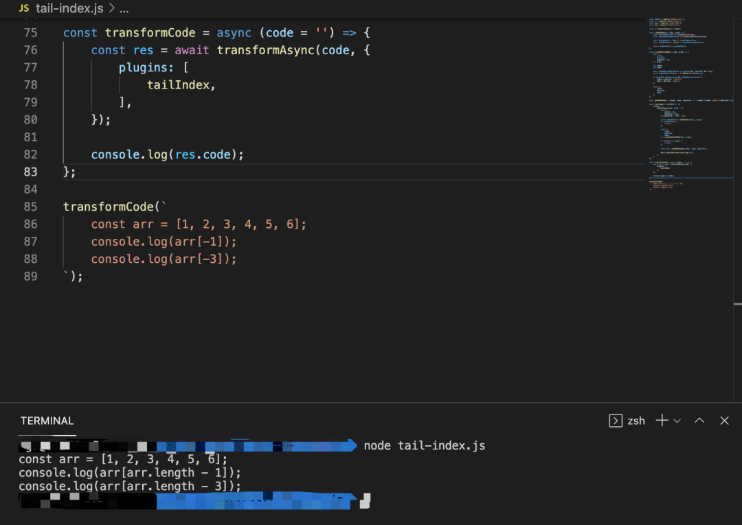 const babel = require('@babel/core');const get = require('lodash/get');const tailIndex = rootPath => ({ visitor: { MemberExpression: path => { const { object: obj, property: prop, } = get(path, 'node', {}); const isNotMatch = codeNotMatch(obj, prop); if (isNotMatch) { return; }; const { index, operator, name, } = createMatchedKeys(obj, prop); if (!index || !name) { return; }; const res = genHeadIndex(index, name, operator); path.replaceWithSourceString(res); }, },});MemberExpression 就是当前要处理的语句类型。