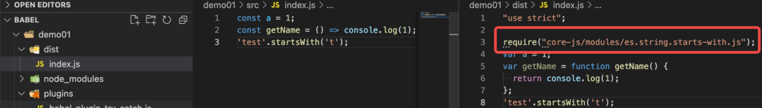 可以看到,代码顶部多了 require("core-js/modules/es.string.starts-with.js"),通过阅读 require 近来的源码 [8],它内部实现了字符串的 startsWith 方法,这样就完成了 built-in 类型的转换。