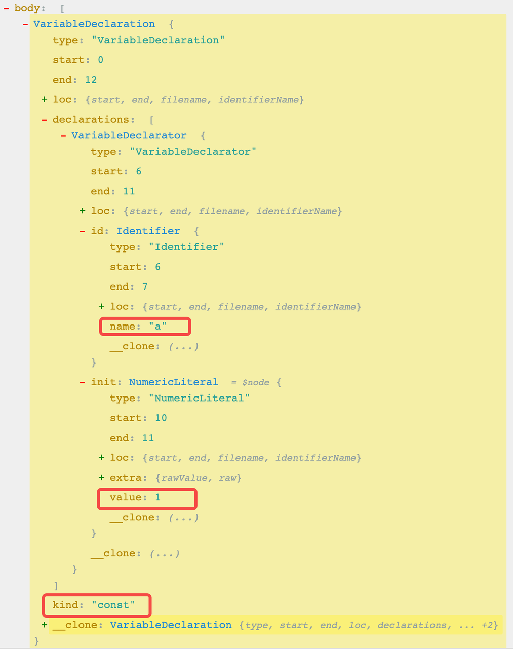 词法分析之后,代码就已经变成了一个 Tokens 数组,现在需要通过语法分析把 Tokens 转化为 AST。例如上面的代码转成的 AST 结构如下(在线查看 [3]):