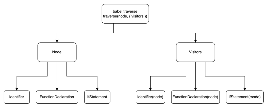 以上是 babel 转换阶段操作节点的思路,具体实现是:babel 维护一个称作 Visitor 的对象,这个对象定义了用于 AST 中获取具体节点的方法,如果匹配上一个 type,就会调用 visitor 里的方法,实现如下: