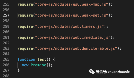 "use strict";function test() { new Promise();}test();var arr = [1, 2, 3, 4].map(function (item) { return item * item;});console.log(arr);当我们使用 useBuiltIns:“entry” 时 (入口文件需要引入 core-js),由于我们没有指定 targets,结果当然是引入了一堆包。