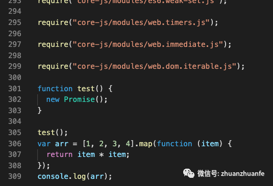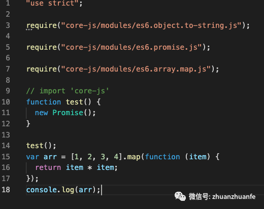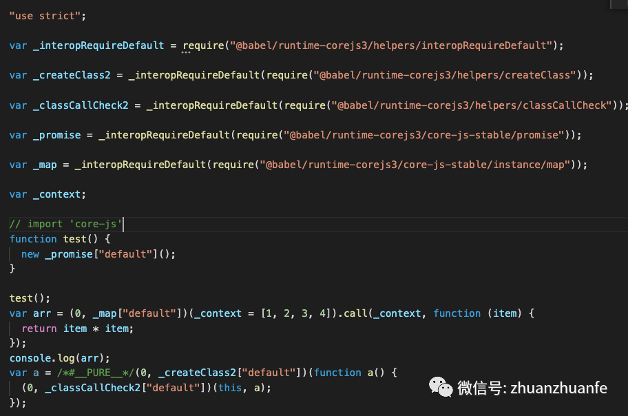 function test() { new Promise()}test()const arr = [ 1 , 2 , 3 , 4 ].map(item => item * item)console.log(arr)我们没有配置 useBuiltIns 时,preset-env 只对代码的语法进行了处理,对于新增的 api 并没有引入对应的 polyfill。下图是转换结果: