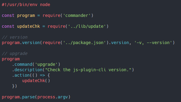 // 请求 lib/update.jsconst updateChk = require('../lib/update')// upgrade 检测更新program // 声明的命令 .command('upgrade') // 描述信息,在帮助信息时显示 .description("Check the js-plugin-cli version.") .action(() => { // 执行 lib/update.js 里面的操作 updateChk() })添加后的代码应该如图所示:记得把