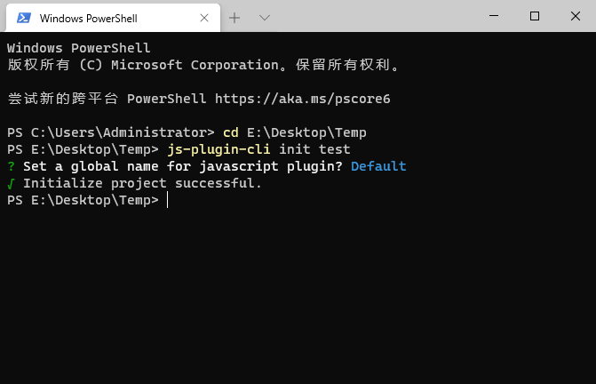 // 请求 lib/init.jsconst initProject = require('../lib/init')// init 初始化项目program .name('js-plugin-cli') .usage('<commands> [options]') .command('init <project_name>') .description('Create a javascript plugin project.') .action(project => { initProject(project) })打开控制台,输入命令 js-plugin-cli init 你的项目名称 查看效果:这样就完成整个脚手架的搭建了~ 然后可以发布到 npm,以全局安装方式进行安装(记得