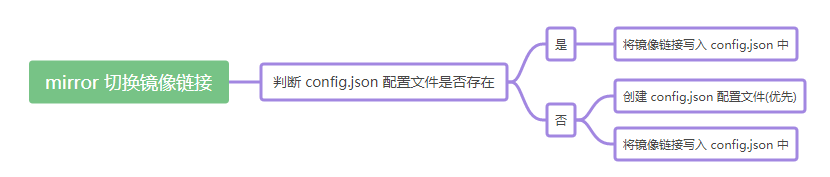 为了能够记录切换后的镜像链接,我们需要在本地创建 config.json 文件来保存相关信息,当然不是由我们手动创建,而是让脚手架来创建,整个逻辑过程如下:所以我们还需要在