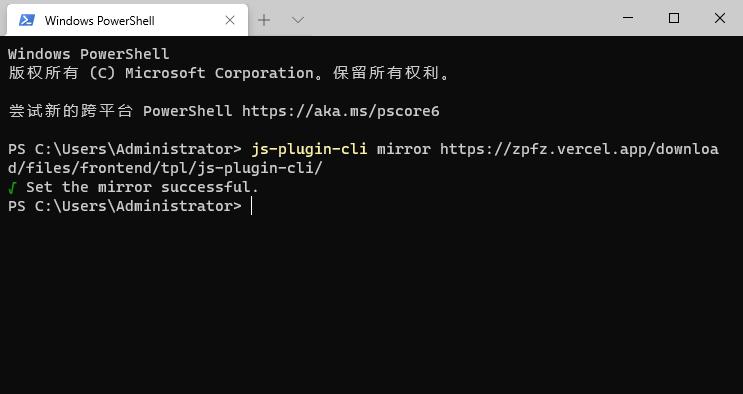 // 请求 lib/mirror.jsconst setMirror = require('../lib/mirror')// mirror 切换镜像链接program .command('mirror <template_mirror>') .description("Set the template mirror.") .action((tplMirror) => { setMirror(tplMirror) })打开控制台,输入命令 js-plugin-cli mirror 你的镜像链接 查看效果:此时,在项目下应该已经生成 config.json 文件,里面相关内容应该为: