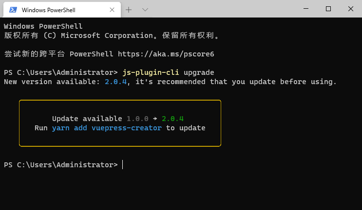 js-plugin-cli 下 package.json 的 name 改为 vuepress-creator,version 默认为 1.0.0,而 npmjs 上 vuepress-creator 脚手架最新版本为 2.x,因此会有更新的提示。