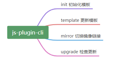 我们先用思维导图来策划一下我们的脚手架需要有哪些主要命令:init(初始化模板)、template(下载模板)、mirror(切换镜像)、upgrade(检查更新),相关导图如下: