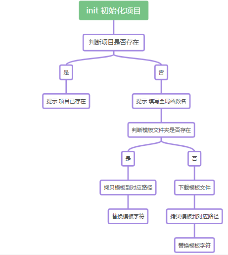 // 请求 fs-extra 库,用于文件操作const fse = require('fs-extra')// 请求 ora 库,用于初始化项目时等待动画const ora = require('ora')// 请求 chalk 库const chalk = require('chalk')// 请求 log-symbols 库const symbols = require('log-symbols')// 请求 inquirer 库,用于控制台交互const inquirer = require('inquirer')// 请求 handlebars 库,用于替换模板字符const handlebars = require('handlebars')const path = require('path')// 请求 download.js 文件,模板不在本地时执行该操作const dlTemplate = require('./download')async function initProject(projectName) { try { const exists = await fse.pathExists(projectName) if (exists) { // 项目重名时提醒用户 console.log(symbols.error, chalk.red('The project already exists.')) } else { // 执行控制台交互 inquirer .prompt([{ type: 'input', // 类型,其他类型看官方文档 name: 'name', // 名称,用来索引当前 name 的值 message: 'Set a global name for javascript plugin?', default: 'Default', // 默认值,用户不输入时用此值 }, ]) .then(async (answers) => { // Spinner 初始设置 const initSpinner = ora(chalk.cyan('Initializing project...')) // 开始执行等待动画 initSpinner.start() // 拼接 template 文件夹路径 const templatePath = path.resolve(__dirname, '../template/') // 返回 Node.js 进程的当前工作目录 const processPath = process.cwd() // 把项目名转小写 const LCProjectName = projectName.toLowerCase() // 拼接项目完整路径 const targetPath = `${processPath}/${LCProjectName}` // 先判断模板路径是否存在 const exists = await fse.pathExists(templatePath) if (!exists) { // 不存在时,就先等待下载模板,下载完再执行下面的语句 await dlTemplate() } // 等待复制好模板文件到对应路径去 try { await fse.copy(templatePath, targetPath) } catch (err) { console.log(symbols.error, chalk.red(`Copy template failed. ${err}`)) process.exit() } // 把要替换的模板字符准备好 const multiMeta = { project_name: LCProjectName, global_name: answers.name } // 把要替换的文件准备好 const multiFiles = [ `${targetPath}/package.json`, `${targetPath}/gulpfile.js`, `${targetPath}/test/index.html`, `${targetPath}/src/index.js` ] // 用条件循环把模板字符替换到文件去 for (var i = 0; i < multiFiles.length; i++) { // 这里记得 try {} catch {} 哦,以便出错时可以终止掉 Spinner try { // 等待读取文件 const multiFilesContent = await fse.readFile(multiFiles[i], 'utf8') // 等待替换文件,handlebars.compile(原文件内容)(模板字符) const multiFilesResult = await handlebars.compile(multiFilesContent)(multiMeta) // 等待输出文件 await fse.outputFile(multiFiles[i], multiFilesResult) } catch (err) { // 如果出错,Spinner 就改变文字信息 initSpinner.text = chalk.red(`Initialize project failed. ${err}`) // 终止等待动画并显示 X 标志 initSpinner.fail() // 退出进程 process.exit() } } // 如果成功,Spinner 就改变文字信息 initSpinner.text = 'Initialize project successful.' // 终止等待动画并显示 ✔ 标志 initSpinner.succeed() console.log(` To get started: cd ${chalk.yellow(LCProjectName)} ${chalk.yellow('npm install')} or ${chalk.yellow('yarn install')} ${chalk.yellow('npm run dev')} or ${chalk.yellow('yarn run dev')} `) }) .catch((error) => { if (error.isTtyError) { console.log(symbols.error, chalk.red("Prompt couldn't be rendered in the current environment.")) } else { console.log(symbols.error, chalk.red(error)) } }) } } catch (err) { console.error(err) process.exit() }}// 将上面的 initProject(projectName) 方法导出module.exports = initProjectlib/init.js 的代码相对较长,建议先熟悉上述的逻辑示意图,了解这么写的意图后就能明白上述的代码啦!抽主要的片段解析: