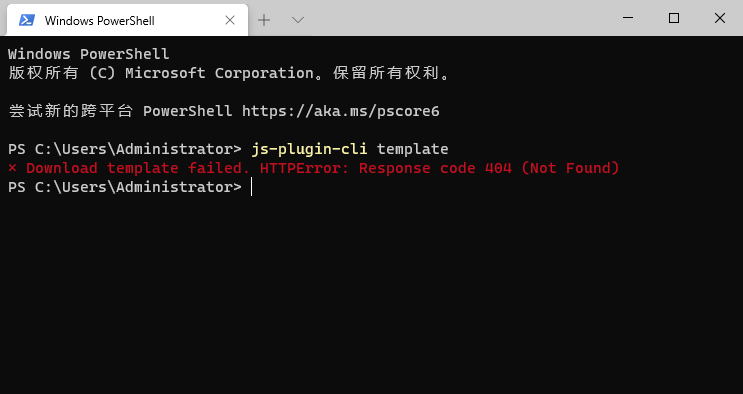 // 请求 lib/download.jsconst dlTemplate = require('../lib/download')// template 下载/更新模板program .command('template') .description("Download template from mirror.") .action(() => { dlTemplate() })打开控制台,输入命令 js-plugin-cli template 查看效果:上图直接报错返回,提示 404 Not Found,那是因为我还没把模板文件上传到服务器上。等把模板上传后就能正确显示了。