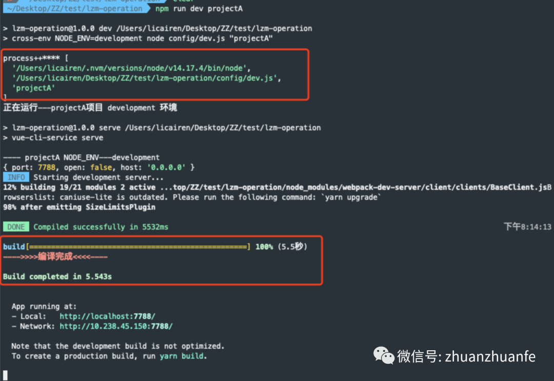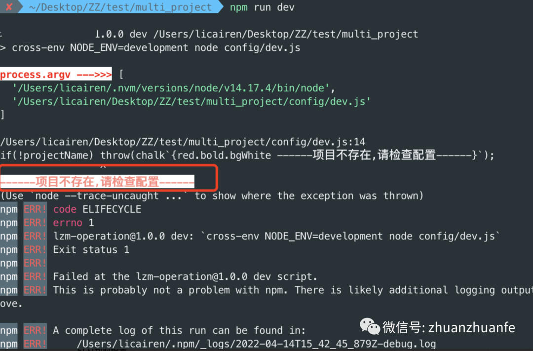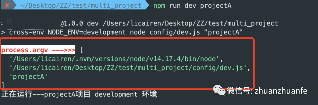 const fse = require("fs-extra");const chalk = require('chalk');let projectName = process.argv[2]; // $ 获取命令行项目名称if(!projectName) throw(chalk`{red.bold.bgWhite ------项目不存在,请检查配置------}`);console.log(chalk.red.bold(`正在运行---${projectName}项目`), `${process.env.NODE_ENV} 环境`, )fse.writeFileSync('./config/project.js', `exports.name = '${projectName}'`)let exec = require('child_process').execSync;exec('npm run serve', {stdio: 'inherit'});**Tips:**命令行参数是固定格式npm run dev projectA,少了项目名称会提示项目不存在。