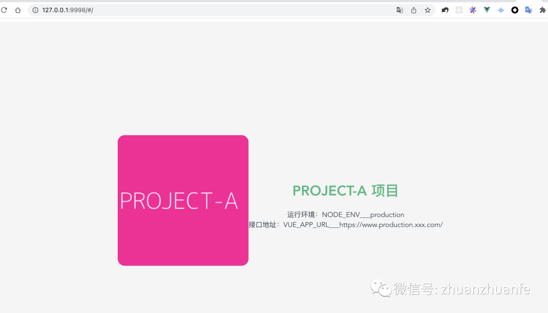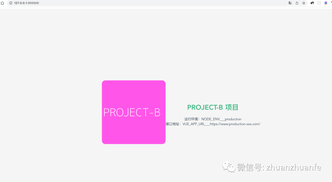 const projectName = require("./project");const config = { // $ 项目A projectA: { pages: { index: { entry: "src/projects/projectA/main.js", template: "public/index.html", filename: "index.html", title: "projectA" }, }, devServer: { port: 7777, // 端口地址 } }, // $ 项目B projectB: { pages: { index: { entry: "src/projects/projectB/main.js", template: "public/index.html", filename: "index.html", title: "projectB" }, }, devServer: { port: 8888, // 端口地址 } }, // $ 项目C projectC: { pages: { index: { entry: "src/projects/projectC/main.js", template: "public/index.html", filename: "index.html", title: "projectC" }, }, devServer: { port: 9999, // 端口地址 } },};const configObj = config[projectName.name];// $ 这里导出的是当前运行项目的配置module.exports = configObj;4) 运行时配置