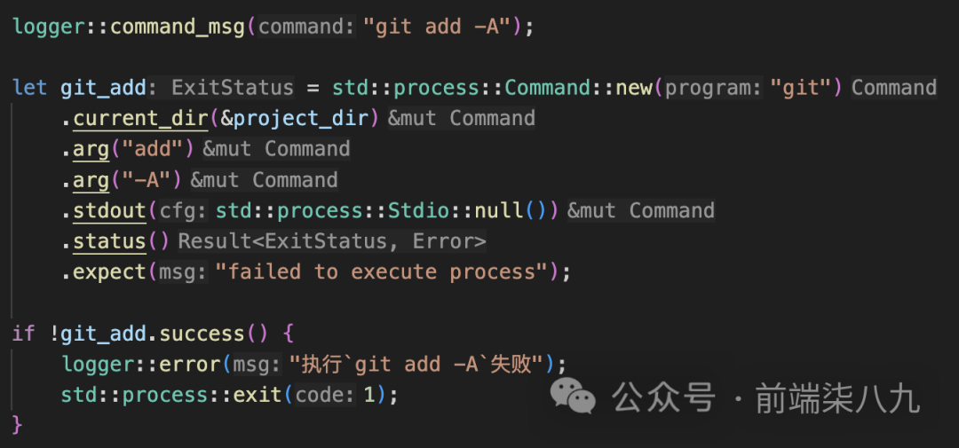 logger::error("执行git add -A失败")打印错误信息,并使用std::process::exit(1)退出程序。这里的 1 是退出码,通常表示程序异常终止。
