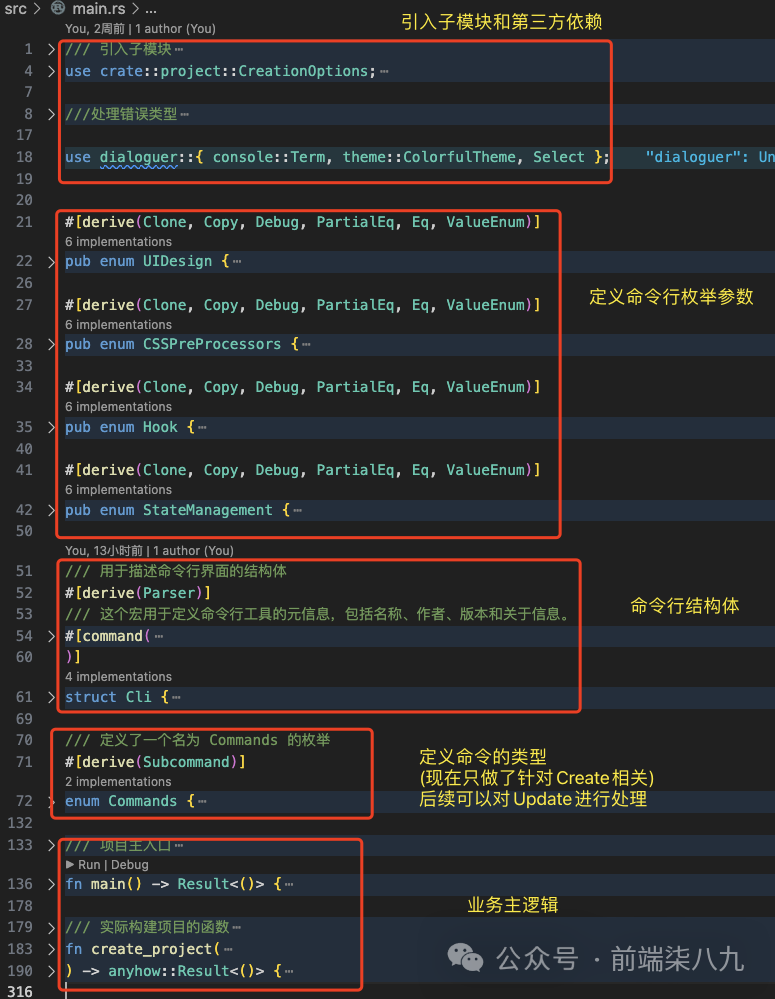 在vscode中我们使用Ctrl+K+0折叠所有的代码块,然后依据逻辑和功能划分。可以将main.rs划成 5 部分,如下图。