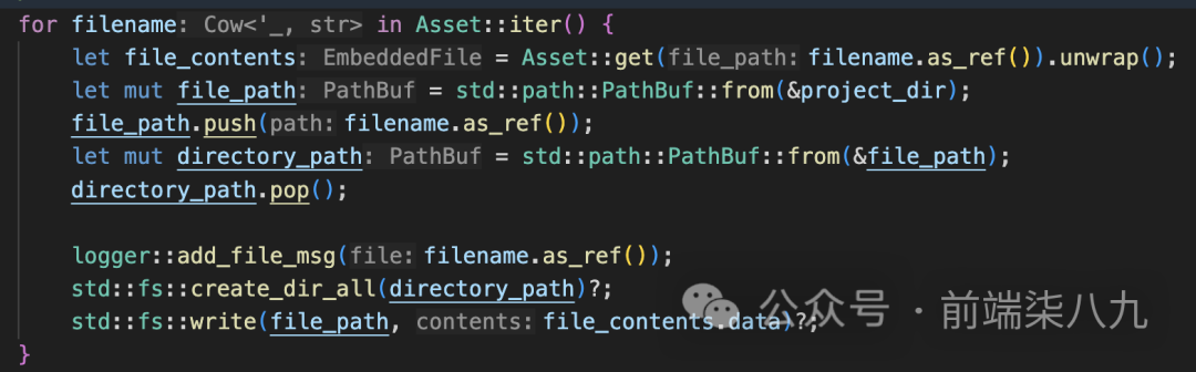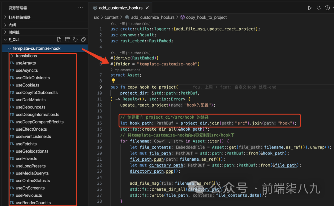 其实它的内部逻辑也很简单,利用RustEmbed指向template-customize-hook, 然后遍历其中的文件,然后复制到项目中。