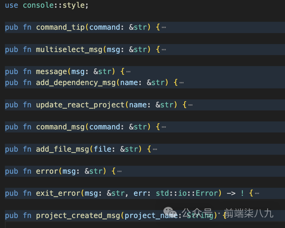 pub fn message(msg: &str) { println!("[{}] {}", style("f_cli").blue(), msg)}message函数接受一个字符串切片msg作为参数,代表要打印的消息。函数体内,它使用